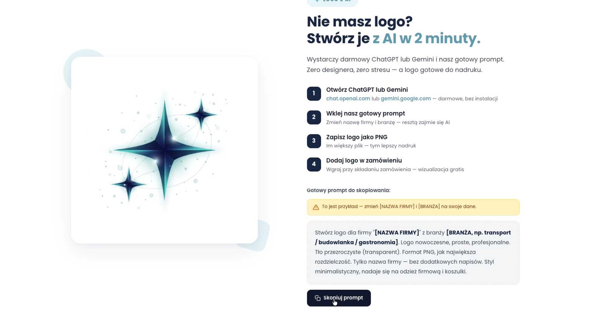 Skopiuj tekst poniżej, wklej do ChatGPT lub Gemini i zmień tylko nazwę firmy oraz branżę. AI wygeneruje logo w kilkanaście sekund.